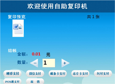 通過文件掃描、上傳云端等技術實現(xiàn)身份證復印、文件復印、手機文件打印、U盤文件打印等功能,支持投幣、微信、支付寶、云閃付等多種支付方式,可靈活的部署在商場、社區(qū)、工業(yè)園、辦事大廳等有復印打印需求的場合。便民復印機操作簡單,可以無人值守,24小時提供服務。