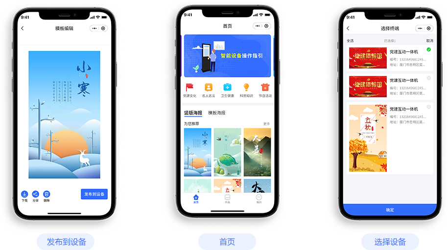 平臺(tái)內(nèi)置近1000+套設(shè)計(jì)模板,覆蓋應(yīng)用場(chǎng)景、包括:節(jié)日宣傳、科普知識(shí)、公告通知、詩詞鑒賞、節(jié)日活動(dòng)、衛(wèi)生健康等主題。用戶不僅可以快速修改模板內(nèi)容,還可以插入圖片等操作,并發(fā)布到云屏設(shè)備。